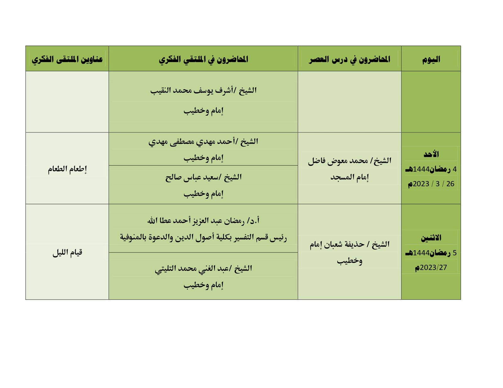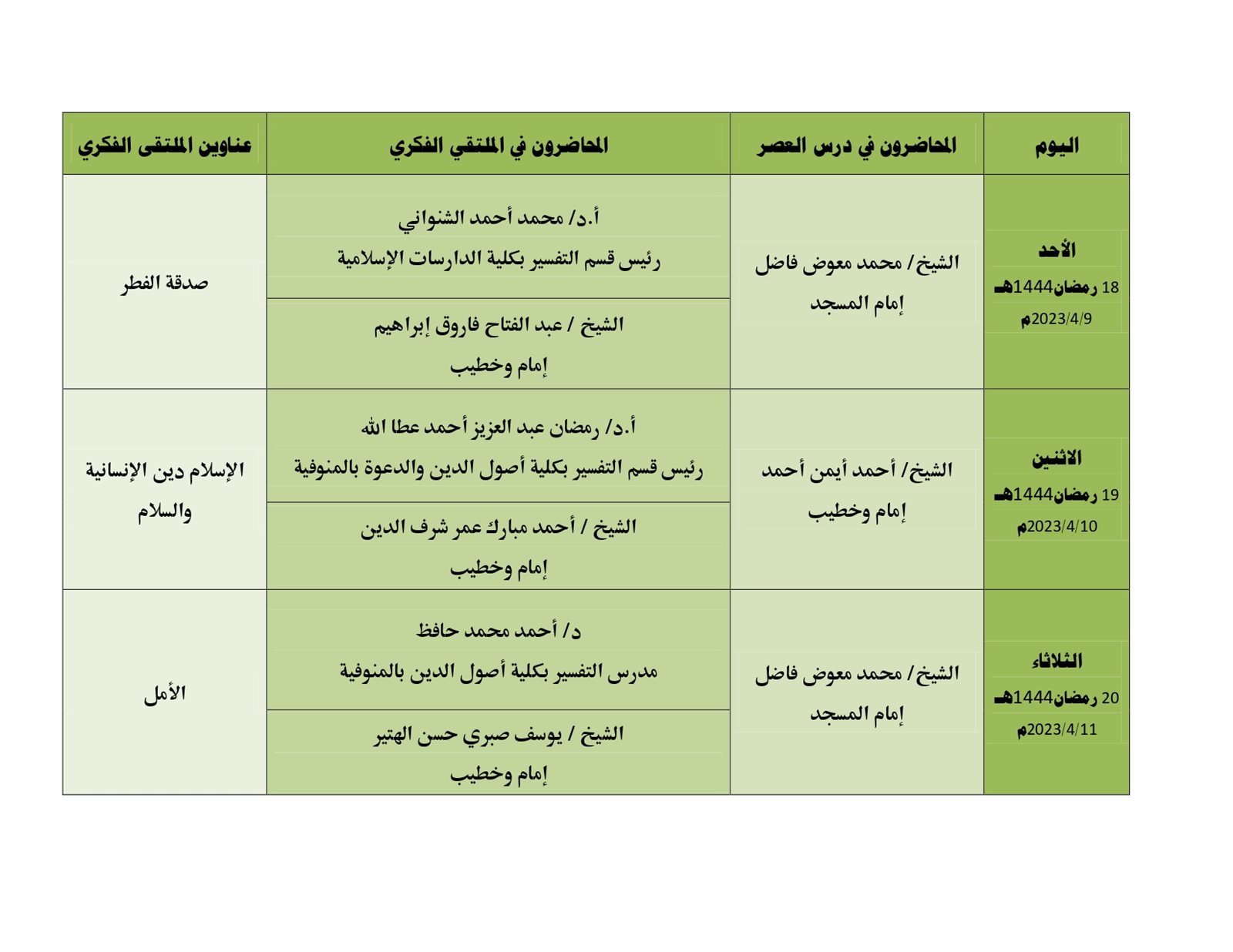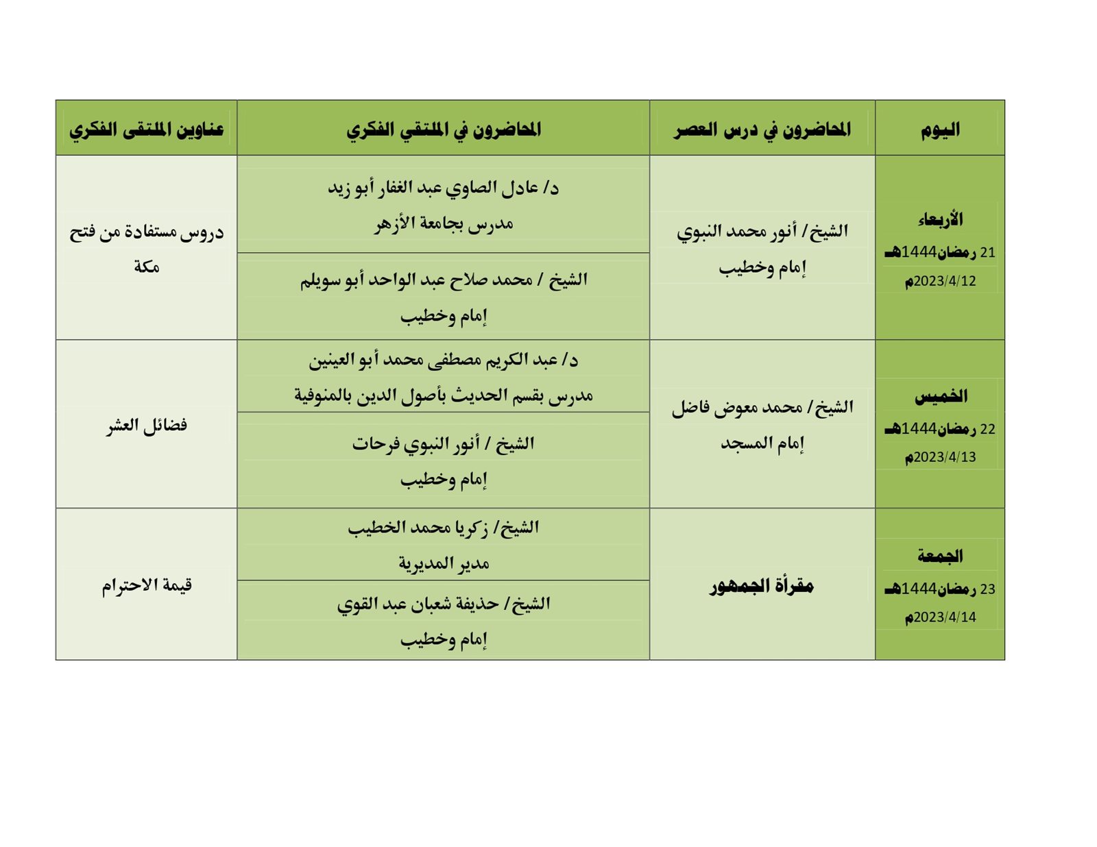 ويعقد يوميًّا عقب صلاة التراويح بمسجد الأنصار- شبين الكوم- المنوفية، وفق الجدول التالي: