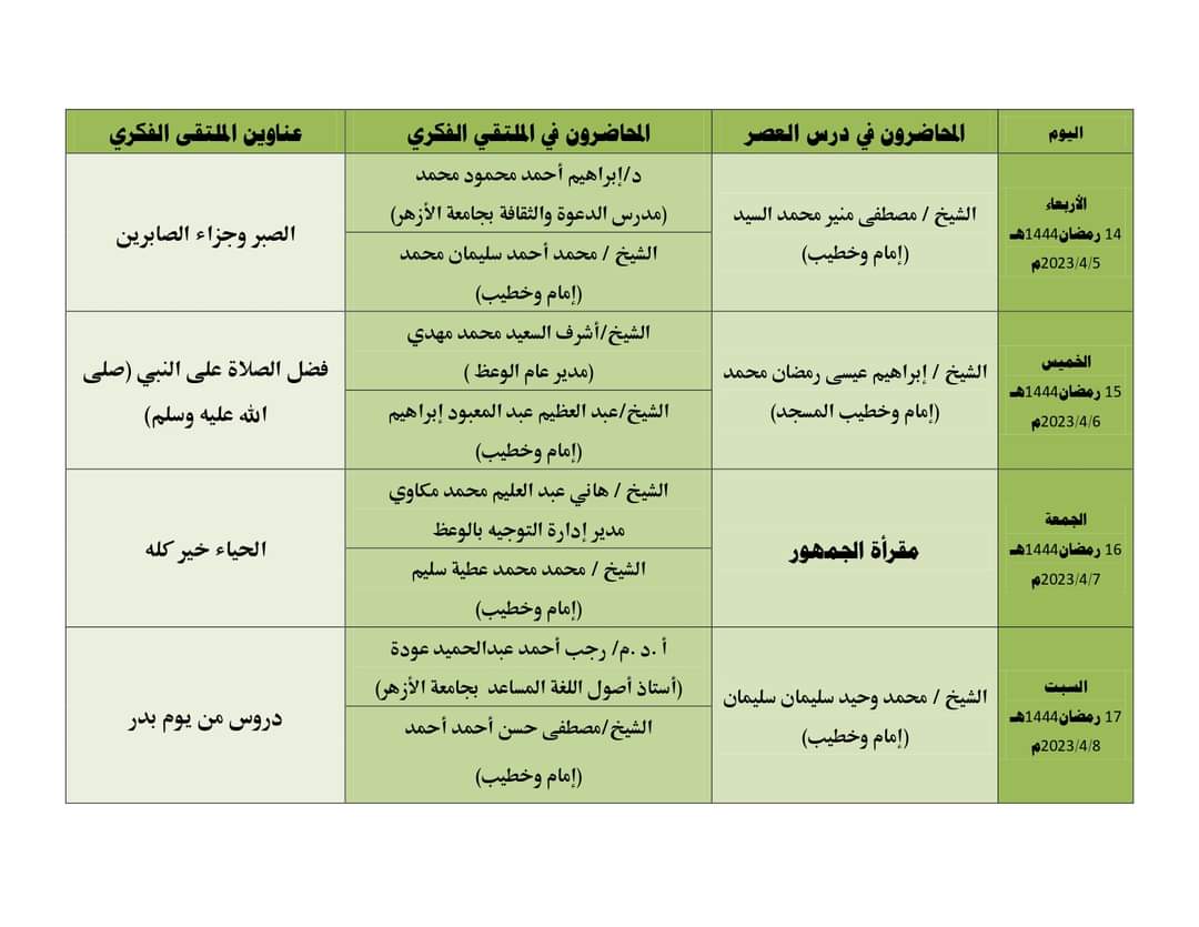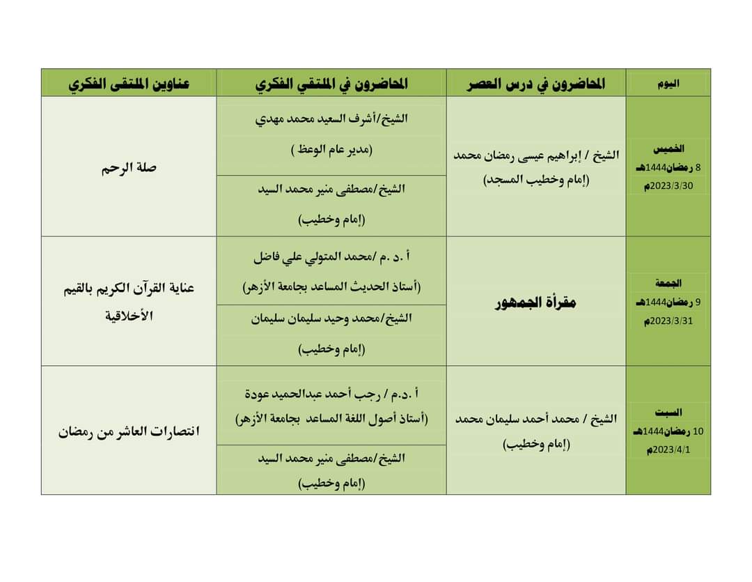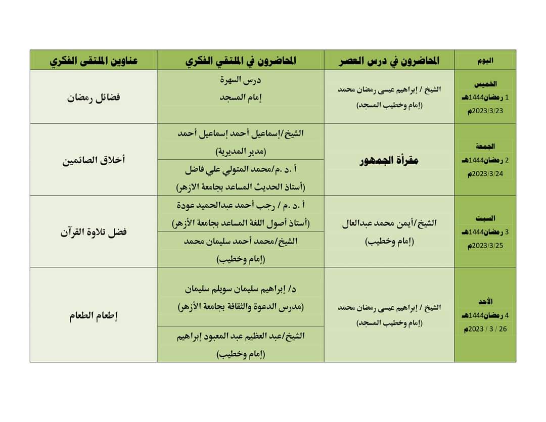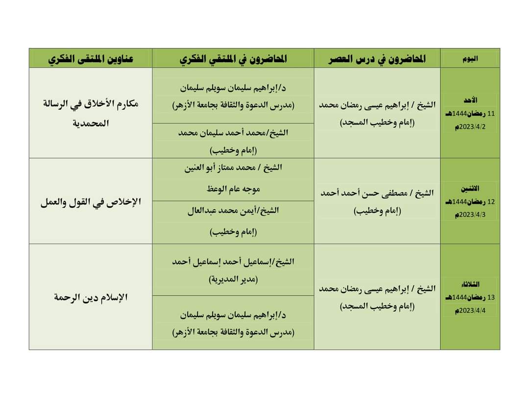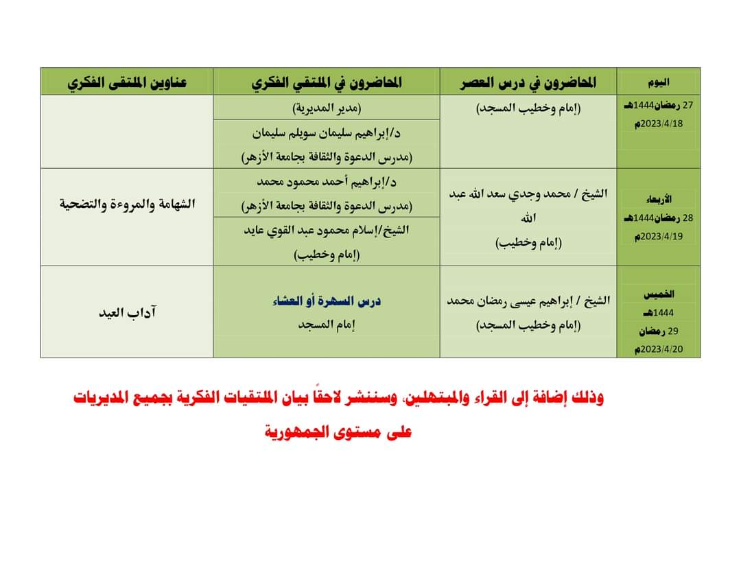 ومن جانبه قال فضيلة الدكتور الشيخ إسماعيل أحمد إسماعيل أحمد مدير مديرية الأوقاف في محافظة لإسماعيلية إن المديرية قد انتهت من الإعداد لملتقى الفكر الرمضاني عام 1444هــ - 2023م الذي يعقد يوميًّا عقب صلاة التراويح بمسجد ( أبو بكر الصديق) بميدان شمبليون بحي الإفرنج بالإسماعيلية.