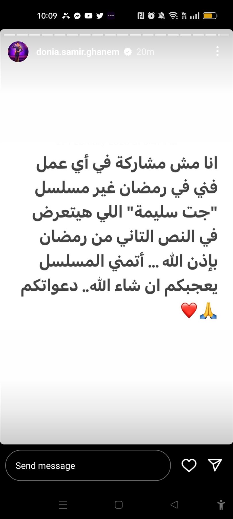وقالت عبر حسابها الشخصي بموقع تبادل الصور والفيديوهات إنها لم تشارك فى أي عمل بموسم دراما رمضان 2023 إلا من خلال مسلسلها الذي يحمل اسم (جت سليمة) والذي تقرر عرضه بشكل حصري عبر شبكة قنوات Cbc طوال أيام شهر رمضان.