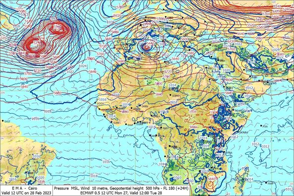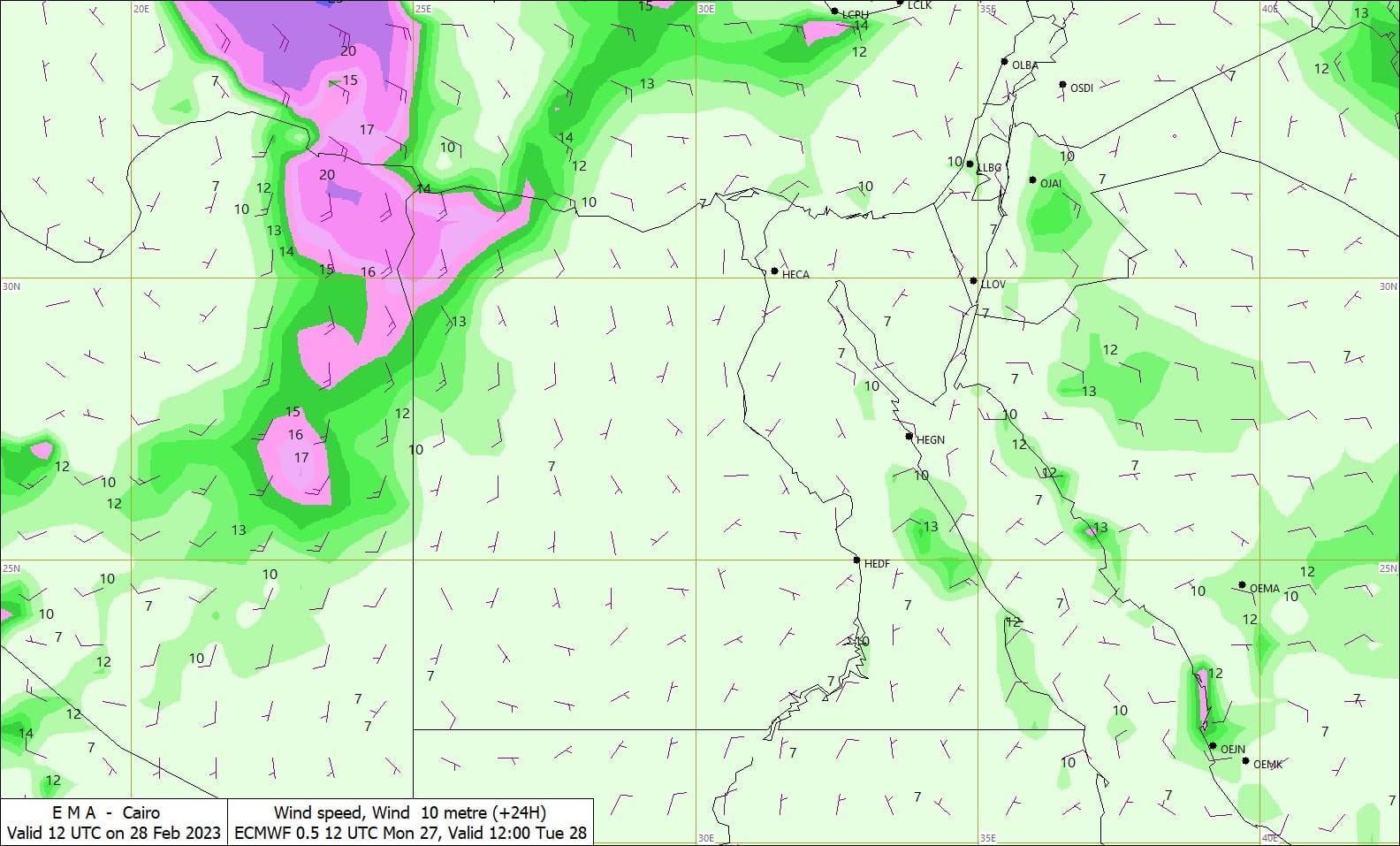 ومن المتوقع أن يكون هناك شبورة مائية في الصباح الباكر على بعض الطرق المؤدية من وإلى القاهرة الكبرى والوجه البحري والسواحل الشمالية ومدن القناة ووسط سيناء وشمال الصعيد، ونشاط رياح على مناطق السواحل الشمالية الغربية على فترات متقطعة، قد تكون نشطة مثيرة للرمال والأتربة غربًا.