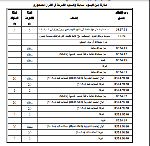 وتنص المادة الثانية على: تعديل بعض فئات الضريبة الجمركية الواردة بجدول التعريفة الجمركية المنسقة الصادر بموجب قرار رئيس الجمهورية رقم 2018 لسنة 2022 المشار إليه وفقا للفئات الموضحة الجدول المرفق بهذا القرار.