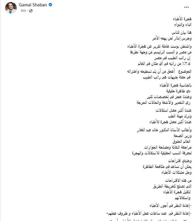 وكتب الدكتور جمال شعبان، عبر صفحته بالفيس بوك، عن ظاهرة هجرة الأطباء المصريين للخارج فقال: "هجرة الأطباء.. الداء والدواء هذا بيان للناس وجرس إنذار لمن يهمه الأمر"