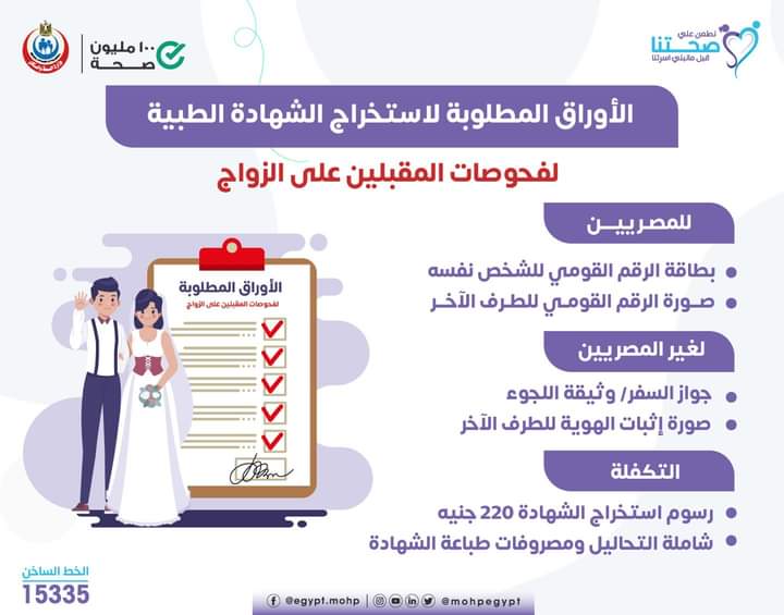 الأوراق المطلوبة لاستخراج الشهادة الطبية للمقبلين على الزواج