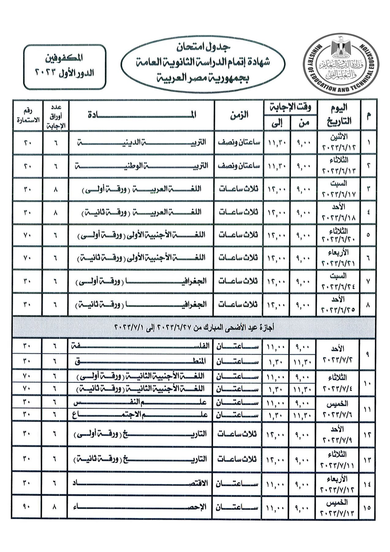 ومن المقرر أن تبدأ الامتحانات يوم الإثنين الموافق 2023/6/12 وتستمر حتى السبت الموافق 2023/7/15.