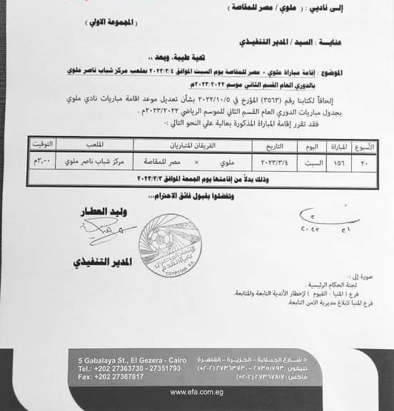 دوري القسم الثاني، قررت لجنة مسابقات القسم الثاني بالاتحاد المصري لكرة القدم تغيير موعد مباراة ملوي ومصر للمقاصة التي كان مقررا إقامتها الجمعة ٣ مارس علي ملعب مركز شباب ناصر ملوي.