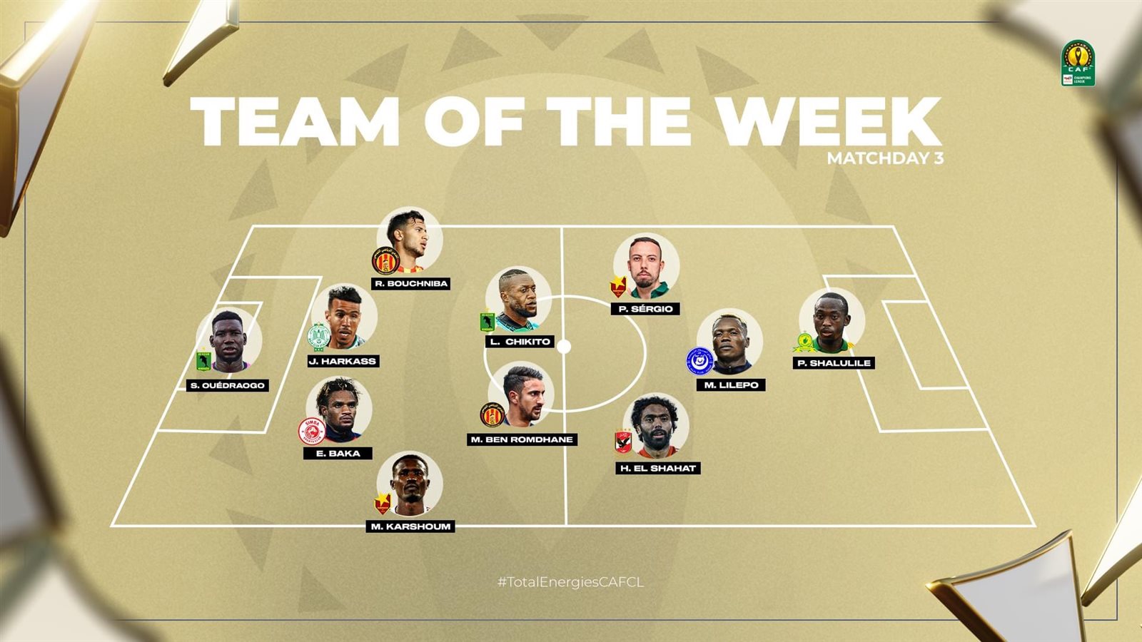 تواجد حسين الشحات، نجم النادي الأهلي، في التشكيل المثالي الذي أعلنه الاتحاد الأفريقي (كاف)، للجولة الثالثة من دور المجموعات لبطولة دوري أبطال أفريقيا، بعد تألقه وتسجيله هدف رائع في شباك صن داونز الجنوب أفريقي.