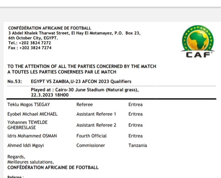 مباراة منتخب مصر الأوليمبي أمام نظيره الزامبي يديرها الحكم تيكلو موجوس تسيجاي، ويعاونه كل من ميشيل مايكل ويوهانس تويدلي.