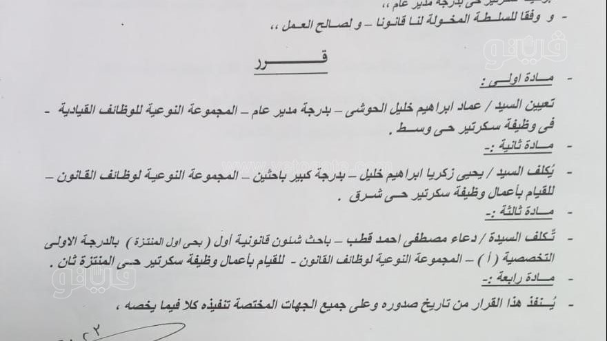 كما شمل القرار تكليف يحيى زكريا، بدرجة كبير باحثين للقيام بأعمال سكرتير عام حي شرق، وتكليف دعاء مصطفى قطب باحث شؤون قانونية أول بحي المنتزه أول للقيام بأعمال سكرتير عام حي المنتزة ثانٍ.