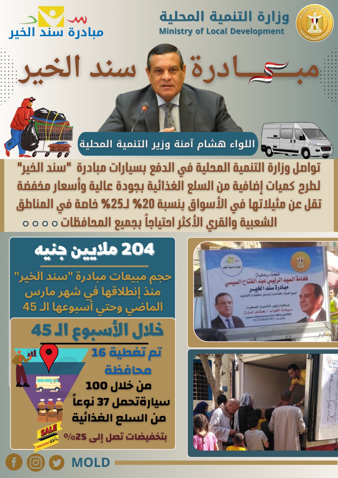 تواصل وزارة التنمية المحلية، الدفع بسيارات مبادرة "سند الخير" التي أطلقتها الوزارة العام الماضي، لطرح كميات إضافية من السلع الغذائية التي يتم طرحها بجودة عالية وبأسعار مخفضة تقل عن مثيلاتها في الأسواق، بنسبة 20% لـ25% خاصة في المناطق الشعبية والقرى الأكثر احتياجًا بجميع المحافظات.