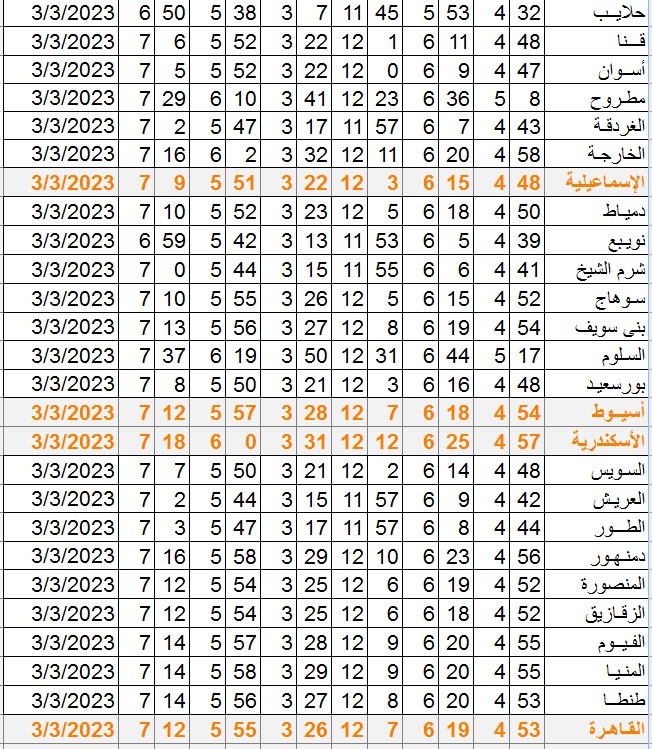 مواقيت الصلاة اليوم وفقًا للتوقيت المحلي لمدينتي القاهرة والإسكندرية وعدد من مدن ومحافظات الجمهورية من واقع بيانات الهيئة العامة للمساحة