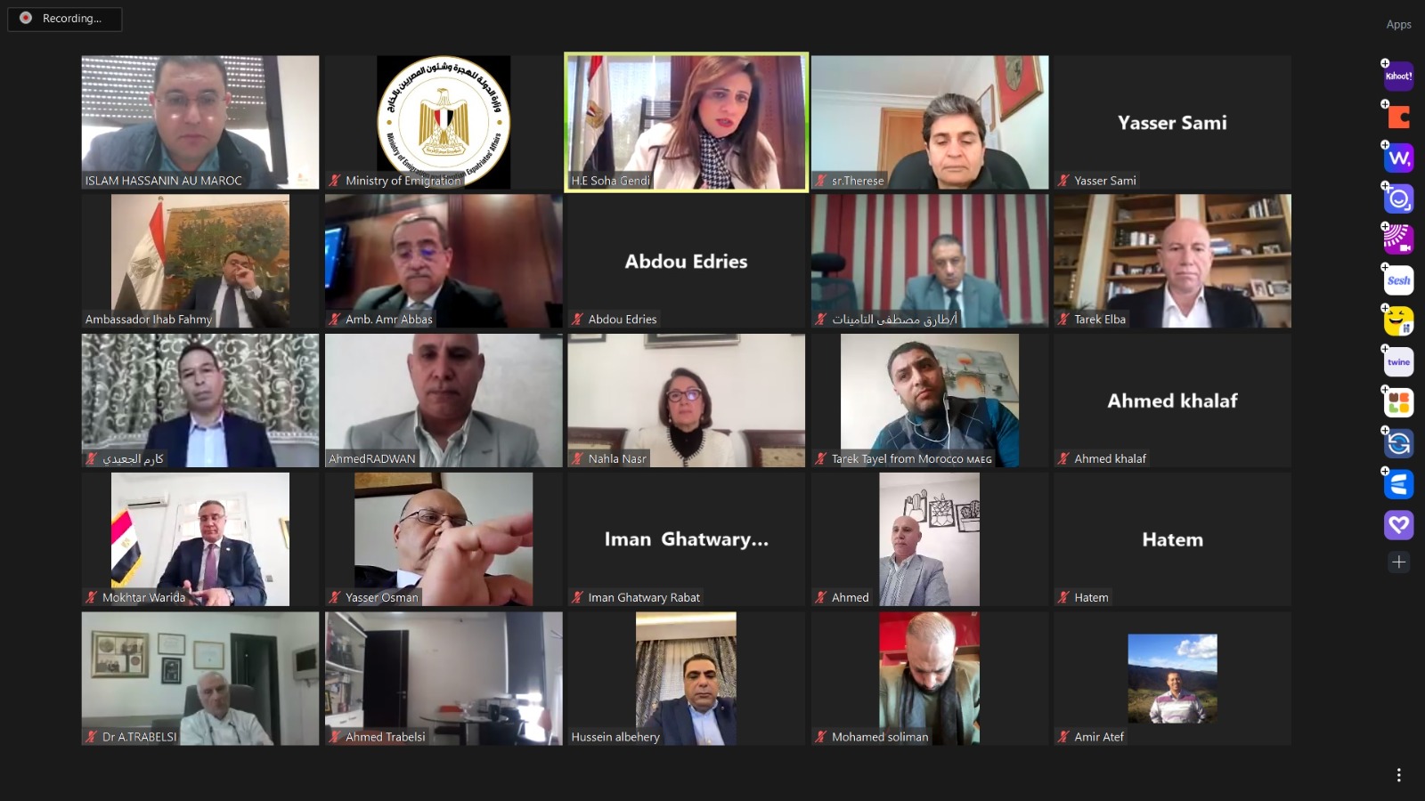 التقت السفيرة سها جندي، وزيرة الدولة للهجرة وشئون المصريين بالخارج، جاليات مصر في تونس والمغرب والجزائر، ضمن مبادرة "ساعة مع الوزيرة"، وذلك بمشاركة السفير عمرو عباس، مساعد وزيرة الهجرة للجاليات، والسادة السفراء: ياسر عثمان، سفير مصر في المغرب، مختار وريدة، سفير مصر في الجزائر، إيهاب فهمي، سفير مصر في تونس. وكذلك عدد من ممثلي مؤسسات ووزارات الدولة المصرية، المعنية بدعم المصريين بالخارج وحل مشكلاتهم.