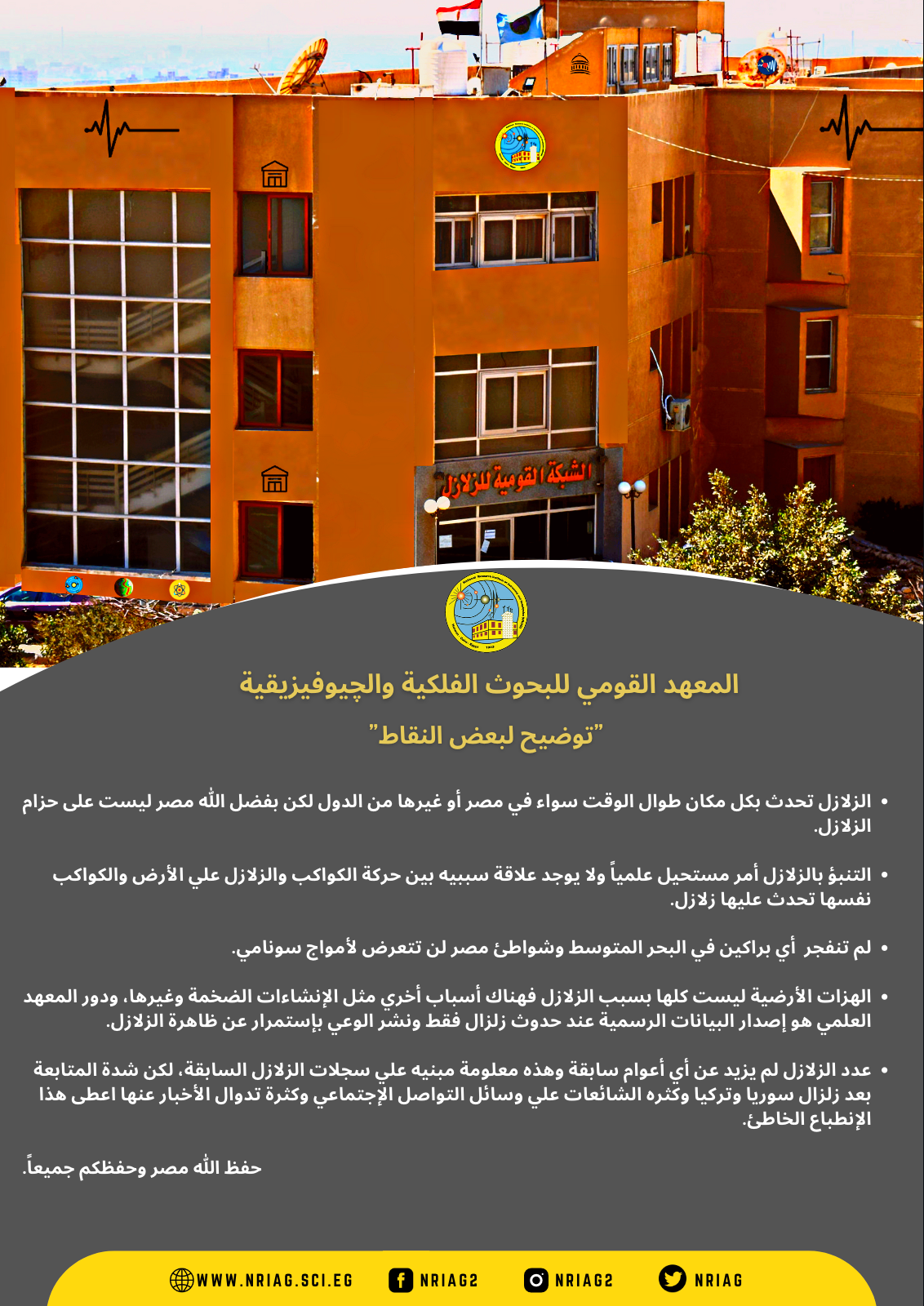 قدم المعهد القومي للبحوث الفلكية والچيوفيزيقية، 5 توضيحات عاجلة ومهمة لجميع المواطنين بشأن الزلازل، وتعرض مصر لتسونامي، ودخول مصر حزام الزلازل.