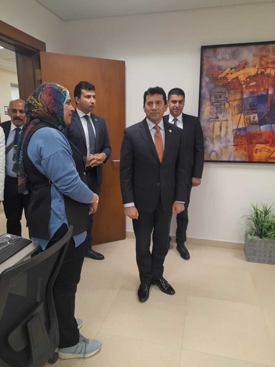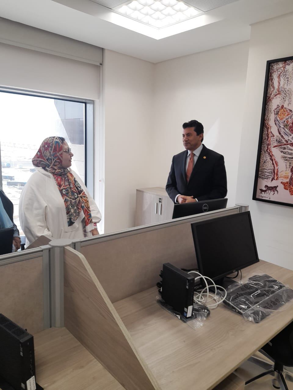 وحرص وزير الشباب والرياضة على المرور بعدد من المكاتب الإدارية حيث التقى العاملين من مختلف الإدارات، مستمعًا لأرائهم حول بيئة العمل، والتقنيات التكنولوجية الجديدة المُطبقة داخل ديوان الوزارة بالحى الحكومى بالعاصمة الإدارية الجديدة، وانطباعاتهم عن أول أيام تواجدهم بشكل كامل بالديوان الجديد.
