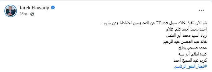 وعن القائمة الجديد للعفو الرئاسي قال طارق العوضي "يتم الان تنفيذ اخلاء سبيل ٣٣ من المحبوسين احتياطيا ومن بينهم: احمد محمد أحمد علي علام، زياد السيد محمد أبو الفضل، خالد عبد المحسن عبد الرحيم، محمد صبحي بطيخ، عبده لطفي أبو سنه، كريم عبد السميع أحمد #لجنة_العفو_الرئاسي".
