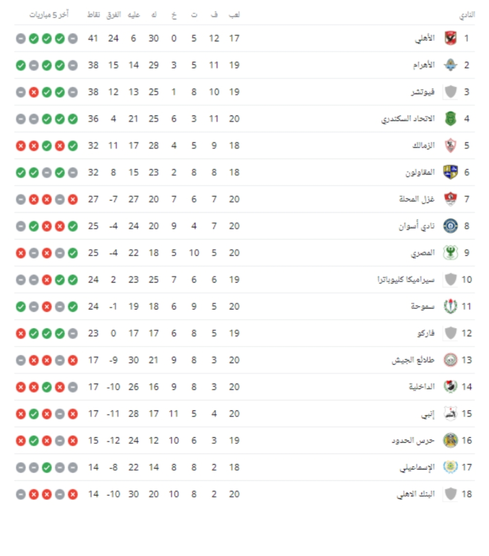 وجاء ترتيب الدوري المصري بعد الجولة العشرين
