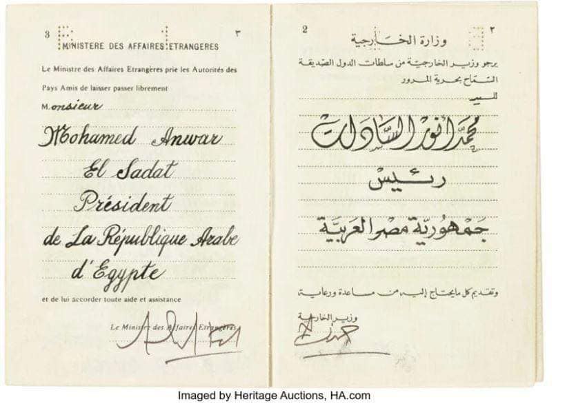 وأعلن دار المزادات العالمية "هيرتاج"، عن بيع جواز سفر الرئيس الراحل أنور السادات، في مزاد علني مقابل أكثر من 47 ألف دولار.