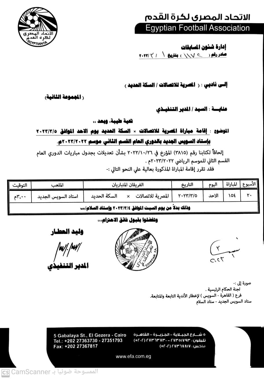 دوري القسم الثاني، قررت لجنة مسابقات دوري القسم الثاني بالاتحاد المصري لكرة القدم تغيير موعد مباراة المصرية للاتصالات والسكة الحديد ، المقرر إقامتها السبت ٤ مارس على ملعب ستاد السلام.