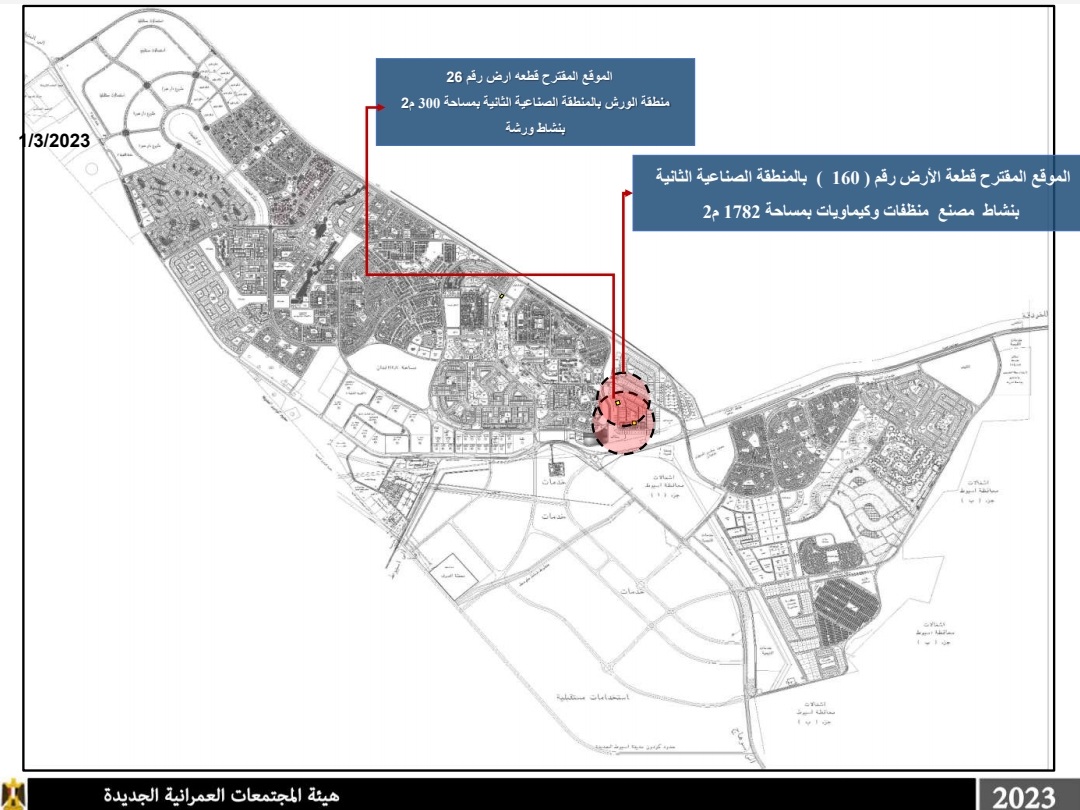 قطعة الأرض رقم (160) بالمنطقة الصناعية الثانية بنشاط مصنع صناعات متنوعة ما عدا غذائي ودوائي وكيماوي) بمساحة 1782 م2 وسعرها التقديري 620 جنيه مصري للمتر مربع.