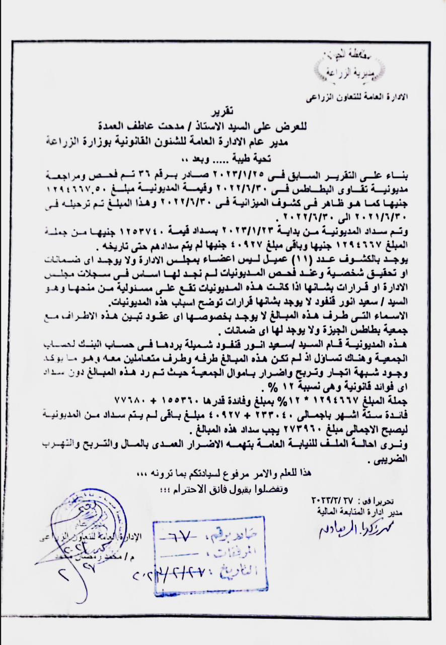 ولفت التقرير الموجهة لمدحت العمدة رئيس إدارة الشئون القانونية بوزارة الزراعة، أن تلك المديونيات تقع على عاتق رئيس منتجي البطاطس بالجيزة سعيد أبو شميلة - المسقطة عضويته من مجلس إدارة الجمعية العامة- بصفته من منحها للعملاء الـ 11 دون وجود أسباب لمنحها، وأنه لا يوجد عقود بشأنها بينهم وبين الجمعية.