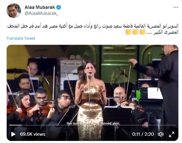 وكتب علاء مبارك رسالته للسوبرانو المصرية فاطمة سعيد، عبر حسابه بموقع التواصل الاجتماعي تويتر: "السوبرانو المصرية العالمية فاطمة سعيد صوت رائع وأداء جميل مع أغنية مصر هى أمي في حفل المتحف المصرى الكبير…".