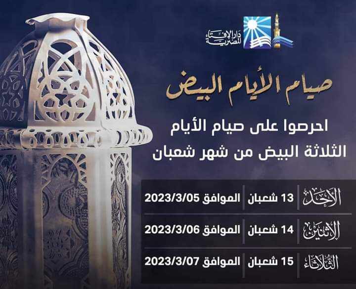 لفتت دار الإفتاء إلى موعد صيام الأيام البيض من شهر شعبان لعام 1444 هجريا، وذلك عبر صفحتها الرسمية على موقع التواصل الاجتماعي فيس بوك حيث جاءت كالتالي: