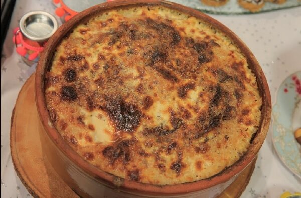 - يرفع الطاجن في الفرن حتى يسخن ثم يضاف إليه الأرز واللبن الساخن والكريمة.