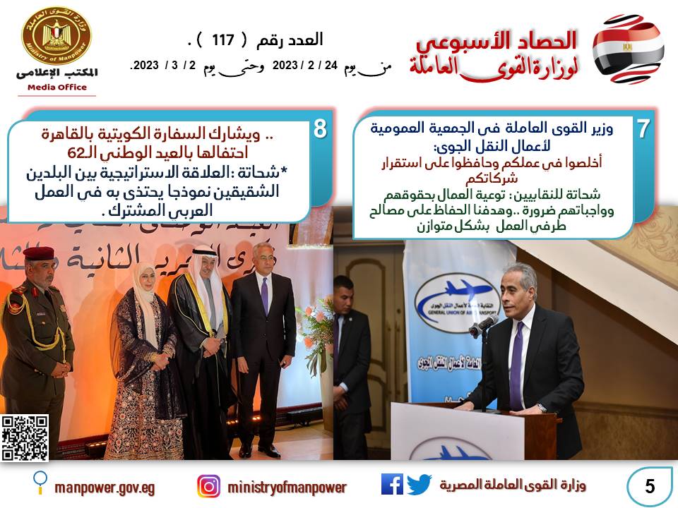 وخلال الأسبوع أيضا، أكد وزير القوى العاملة حسن شحاتة على حرص الوزارة على وجود تنظيم نقابي واع يقوم بدوره في توعية العمال بحقوقهم وواجباتهم،داعيا العمال إلى التحلي بالإخلاص والمصداقية في العمل،والحفاظ على شركاتهم،والعمل على الاستقرار المستمر في مواقع العمل،والسعي باستمرار نحو الحفاظ على مصالح طرفي العمل بشكل متوزان..جاء ذلك خلال كلمة الوزير في الجمعية العمومية العادية للنقابة العامة لأعمال النقل الجوي،بحضور محمد موسي نائب رئيس مجلس إدارة الشركة القابضة لمصر للطيران،وخالد عيش نائب رئيس الاتحاد العام لنقابات عمال مصر وعضو مجلس الشيوخ، وسولاف درويش وكيل لجنة القوى العاملة بمجلس النواب ورئيس النقابة العامة للعاملين بالبنوك، وأشرف الدوكار رئيس النقابة العامة للنقل البري،وأحمد عبدالله رئيس قطاع النقابات العمالية بالجهاز المركزي للمحاسبات، ومحمد حنفي رئيس النقابة العامة للعاملين بالاتصالات، وأحمد الرفاعي القائم بأعمال رئيس النقابة العامة، وهشام الهادي الأمين العامة للنقابة العامة وأعضاء الجمعية العمومية بالنقابة،والذين ألقوا كلمات أكدوا خلالها على دور النقابات كشركاء في عملية التنمية وتعزيز علاقات العمل.