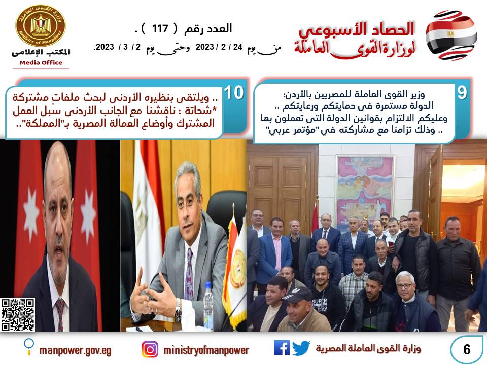 أعلنت وزارة القوى العاملة في بيان لها أن مكتب التمثيل العمالي التابع للوزارة بالسفارة المصرية بالعاصمة الأردنية عمان، تابع مع المسئولين بمؤسسة الضمان الاجتماعي بالأردن-استكمالا لما تم تحويله سابقا- عملية تحويل القائمة الـ 115 من مستحقات الضمان الاجتماعي لنحو 111 عاملًا مصريًا لدى" المؤسسة" غادروا عمان نهائيا، وذكر البيان ان وزير القوى العاملة حسن شحاتة يوجه مكاتب التمثيل العمالي بالخارج - 9 مكاتب تحمي وترعى ما يقرب من 5 ملايين مواطن مصري – بالتواصل المستمر مع العمالة المصرية وتوعيتها بحقوقها وواجباتها،ومساندتها في كافة حقوقها المشروعة.