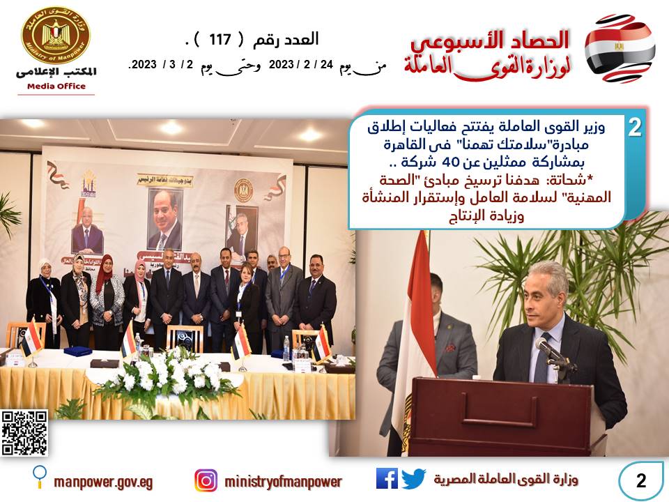 وأكد وزير القوى العاملة حسن شحاتة على أهمية التزام صاحب العمل والعامل بشروط السلامة والصحة المهنية داخل كافة مواقع العمل، وقال "الوزير" خلال افتتاحه فعاليات إطلاق مبادرة "سلامتك تهمنا"، بحضور شريف حوتة عضو مجلس الإدارة المنتدب لشركة مصر للطيران للفنادق، وممثلين عن 40 شركة، والتي نظمتها مديرية القوى العاملة بالقاهرة، بأحد الفنادق، أن توفير وسائل السلامة والصحة المهنية يُحافظ على الأرواح والممتلكات، ويُؤمِن بيئة العمل في القطاعات المختلفة،ودعا "الوزير" كافة مديريات القوى العاملة بالمحافظات،إلى نشر التوعية والتثقيف بأهمية تطبيق مبادئ وإجراءات السلامة داخل كافة مواقع العمل من أجل سلامة العامل والمنشأة، وزيادة الإنتاج والاستقرار في ظل الجمهورية الجديدة التي أرسى قواعدها الرئيس عبد الفتاح السيسي رئيس الجمهورية..