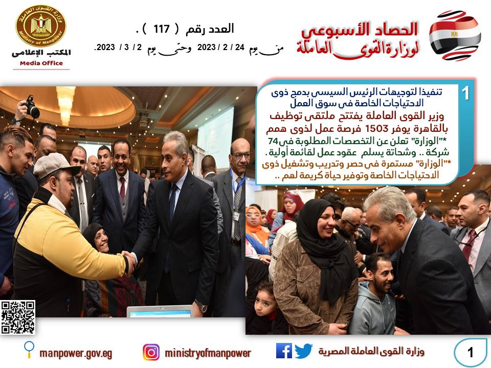 القوى العاملة في 7 أيام: فرص عمل.. حصر وتدريب وتشغيل لذوي الهمم.. دعم للعمالة غير المنتظمة