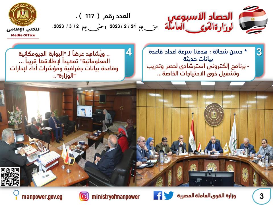 يكشف الحصاد الأسبوعي لوزارة القوى العاملة أيضا عن مجموعة من اللقاءات داخل ديوان عام الوزارة،حيث شاهد "الوزير" تصور بشأن مشروع استرشادي أعدته الوزارة بشأن برنامج إلكتروني مركزي لحصر العمالة من ذوي الهمم تمهيدا لإطلاقه،وعرضًا قدمه مسؤولو البوابة الجيومكانية المعلوماتية لمؤشرات أداء الوزارة،كما تستمر "الوزارة" في توفير فرص العمل والتدريب للشباب من خلال الإدارة العامة للتشغيل خاصة ذوى الهمم منهم فى 3 محافظات،وعودة مستحقات عمالة مصرية بالأردن،كما أن مديريات القوى العاملة بالمحافظات تواصل تنفيذ خطة تدريب الشباب على مهن يحتاجها سوق العمل.. إلى التفاصيل.