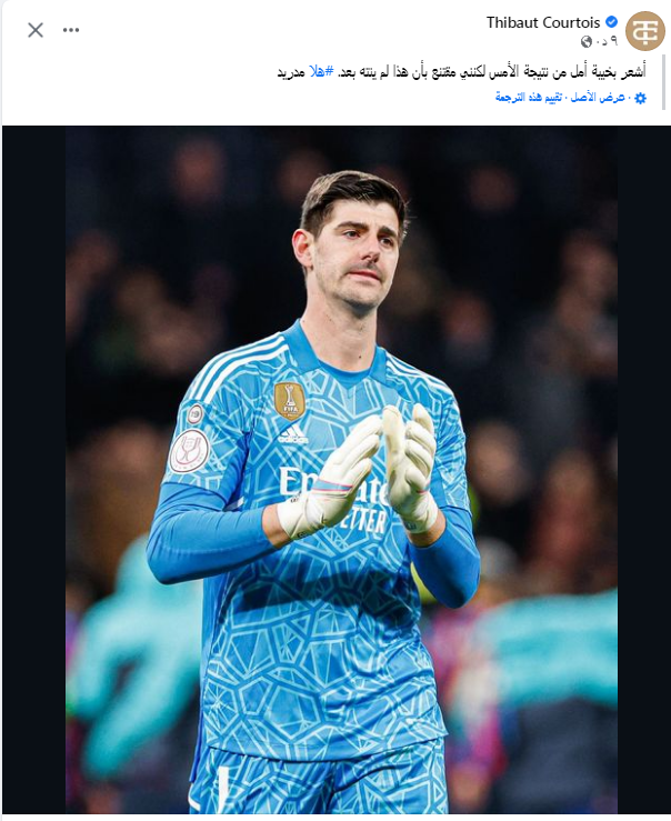 نشر تيبو كورتوا حارس مرمى فريق ريال مدريد عبر حسابه الشخصي فيس بوك بأنه يشعر بخيبة الأمل الشديدة بعد خسارة فريقه أمام برشلونة في ذهاب الكأس.