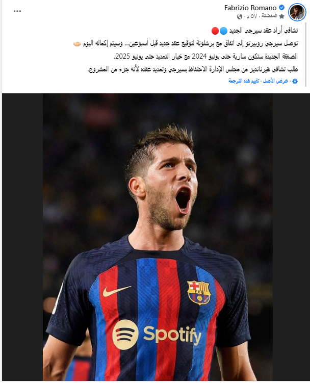 أكد فابريزيو رومانو عن توصل سيرجي روبيرتو إلى اتفاق مع برشلونة لتوقيع عقد جديد قبل أسبوعين وسيتم إكمال تفاصيل التعاقد اليوم.