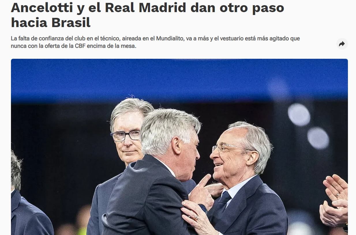 كشف موقع ريليفو الإسباني عن وجود اتفاق بين كارلو أنشيلوتي ومنتخب البرازيل علي أن يقود الإيطالي منتخب السامبا بعد نهاية الموسم مع ريال مدريد.