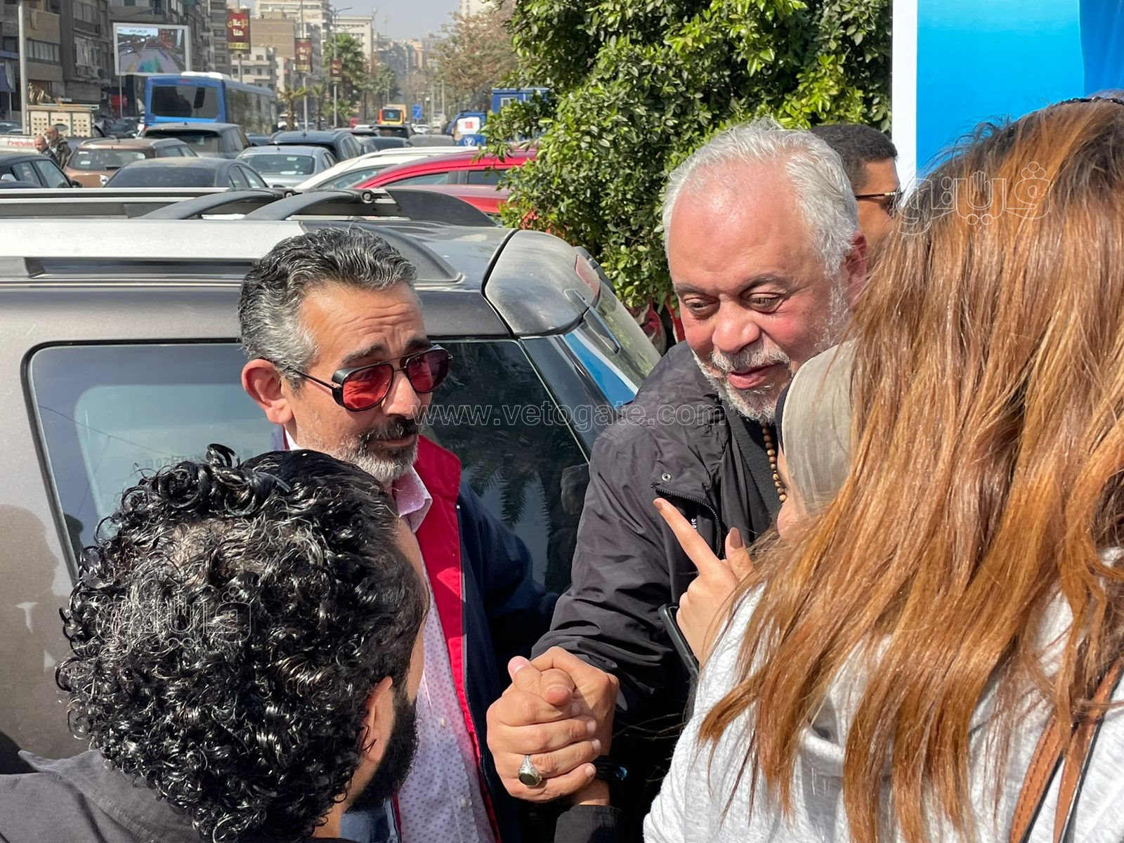 وفور وصول السقا الاف الحاضرين من حوله وحرص علي مصافحة الفنان أشرف زكي المرشح لمقعد نقيب المهن التمثيلية.