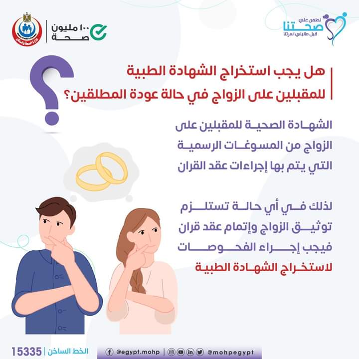 أكدت وزارة الصحة أن الشهادة الطبية للمقبلين على الزواج يجب إصدارها أيضا في حالة عودة المطلقين.