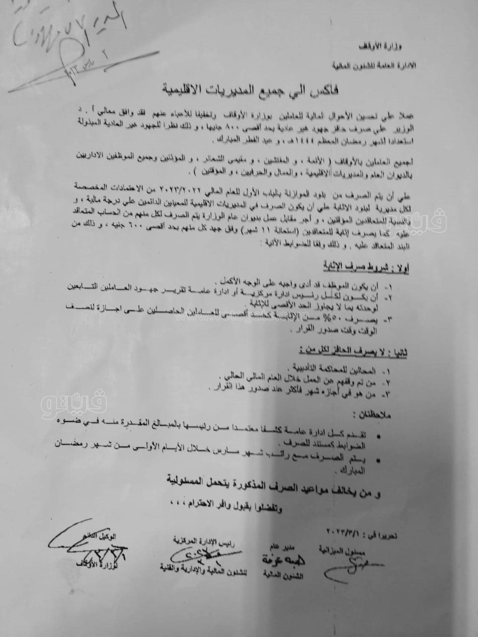 وأكد المنشور الذي وزعته الأوقاف على المديريات أنه سيتم الصرف بالباب الاول للعام المالي 2022، 2023 من الاعتمادات المخصصة لكل مديرية لبنود الإثابة على ان يكون الصرف في المديريات الإقليمية للمعينين الدائمين على درجة مالية وبالنسبة للمتعاقدين المؤقتين وأجر مقابل عمل بديوان عمل بديوان عام الوزارة يتم الصرف لكل منهم من الحساب المتعاقد عليه.