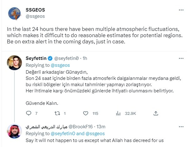 وهنا تفاعل سيف الدين التركي مع تحذيرات معهد SSGEOS"" الهولندي فقال: "أصدقائي الأعزاء صباح الخير، حدثت تقلبات جوية متعددة في الـ 24 ساعة الماضية، مما يجعل من الصعب عمل تقديرات معقولة لمناطق الخطر. يقول توخي الحذر في الأيام المقبلة، فقط تحسبًا وقوع الزلزال. ابق آمنًا."