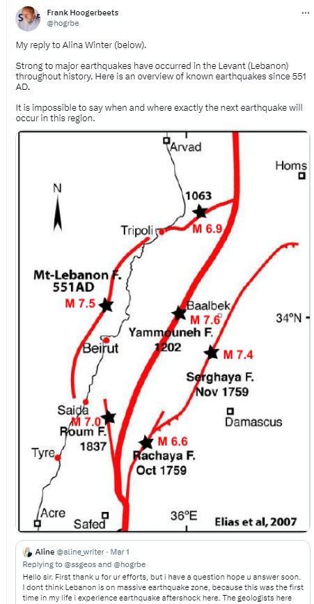 وكشف العالم الهولندي فرانك هوجربتس، المثير للجدل بتوقعاته عن النشاط الزلزالي، عن وقوع زلزال في الماضي لإحدى الدول العربية وهي لبنان فقال: "ردي على الكاتبة ألينا. حدثت زلازل قوية إلى كبيرة في بلاد الشام (لبنان) عبر التاريخ. فيما يلي نظرة عامة على الزلازل المعروفة منذ عام 551 ميلادي."