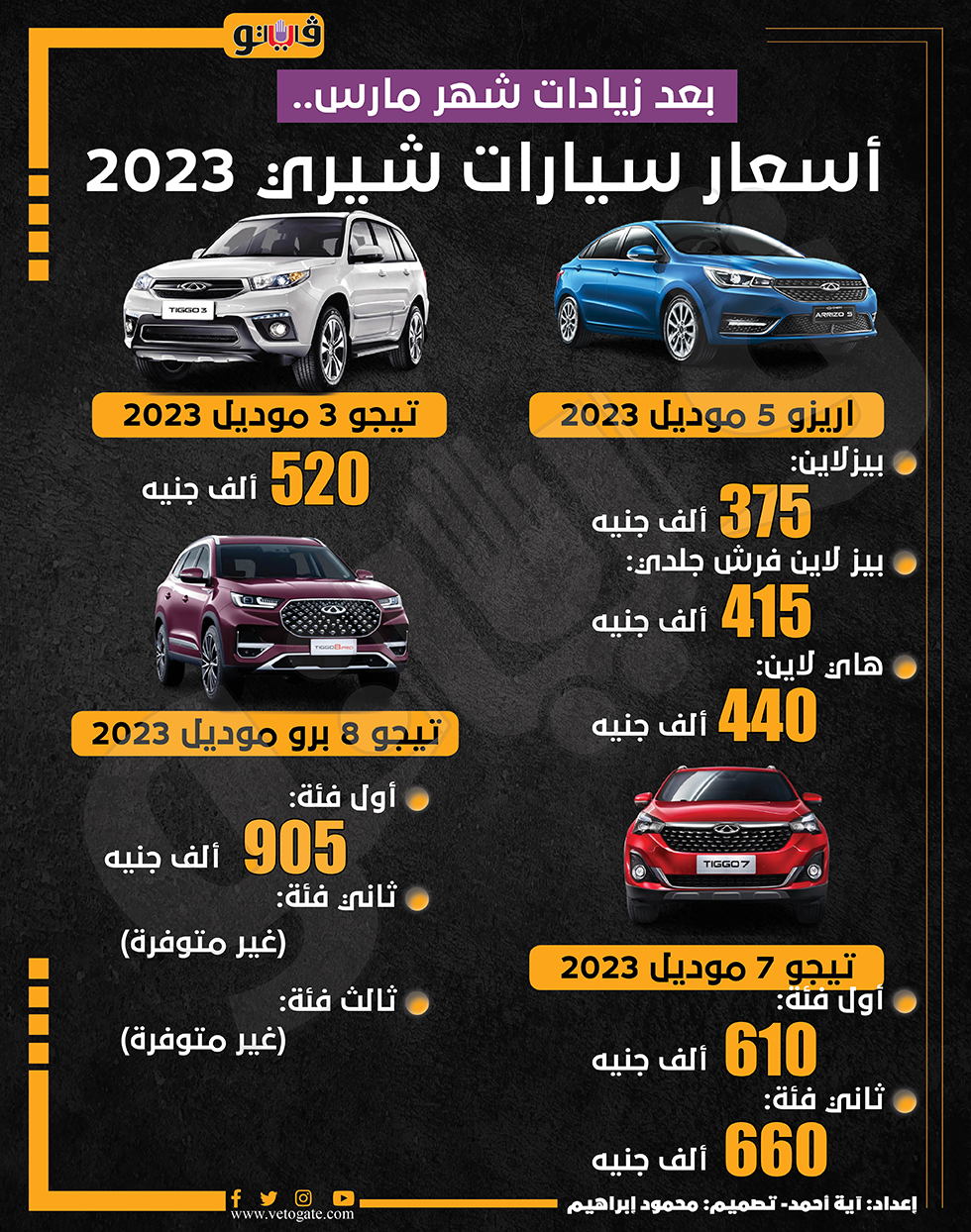 بعد زيادات شهر مارس.. أسعار سيارات شيري 2023 (انفوجراف) السبت 04/مارس/2023 - 03:31 م 3/4/2023 3:31:39 PM أسعار سيارات شيري 2023، فيتو آية أحمد شارك طباعة 18 حجم الخط شارك طباعة شيري تيجو 8 شيري تيجو شيري أريزو 5 شيري تيجو 7 شيري اريزو