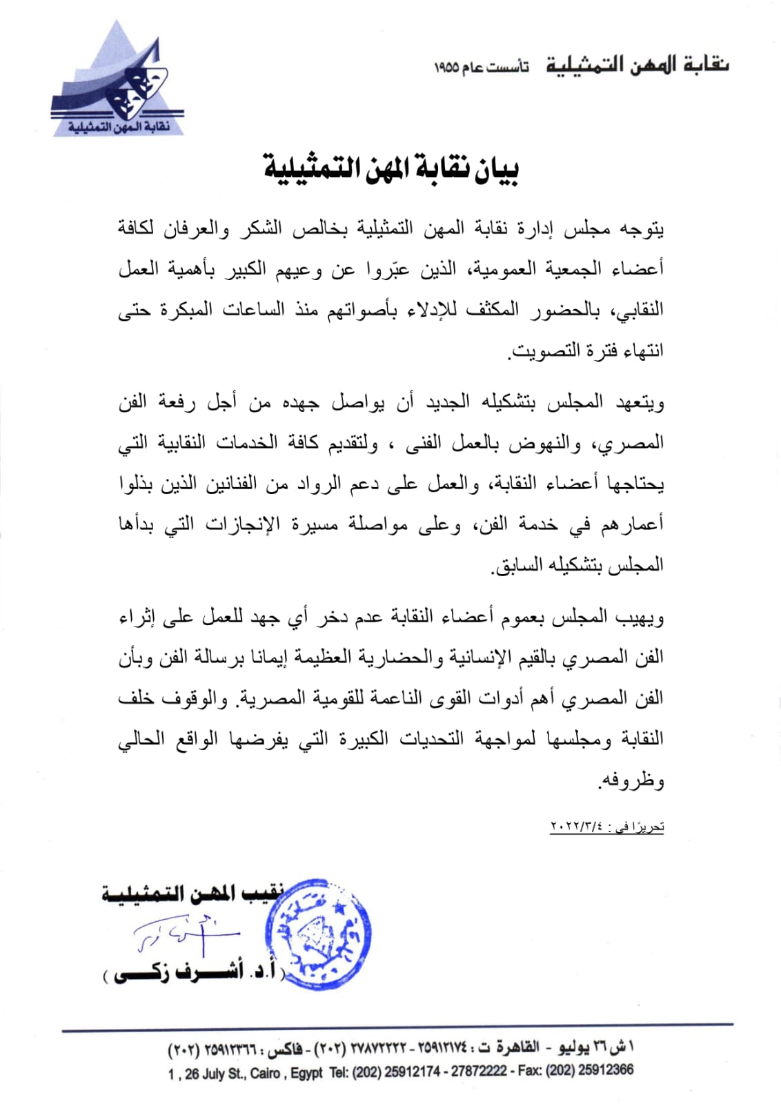 وتابع: "ويهيب المجلس بعموم أعضاء النقابة عدم دخر أي جهد للعمل على إثراء الفن المصري بالقيم الإنسانية والحضارية العظيمة إيمانًا برسالة الفن وبأن الفن المصري أهم أدوات القوى الناعمة للقومية المصرية، والوقوف خلف النقابة ومجلسها لموافقة التحديات الكبيرة التي يفرضها الواقع الحالي وظروفه".