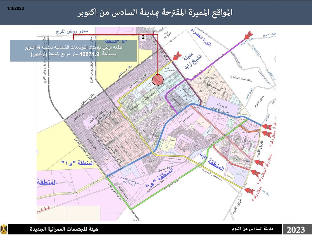 قطعة أرض بامتداد التوسعات الشمالية بمدينة 6 أكتوبر بمساحة 40871.9 متر مربع بنشاط ترفيهي قيمة مقابل الانتفاع السنوي 2615850 جنيه مصري والتامين 261585 جنيها مصريا.