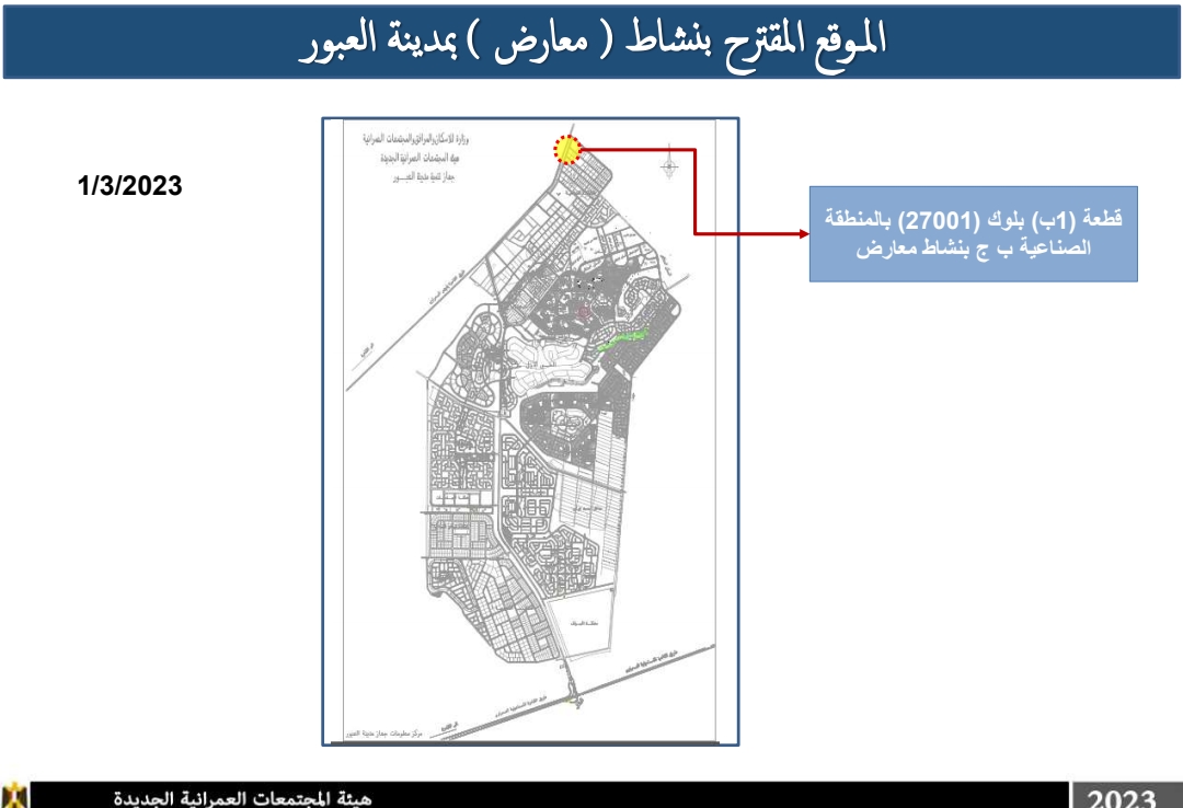 قطعة (1 ب) بلوك (27001) بالمنطقة الصناعية ب – ج بنشاط معارض بمساحة 18930.60م2 وسعرها التقديري 14305 جنيه مصري للمتر مربع.