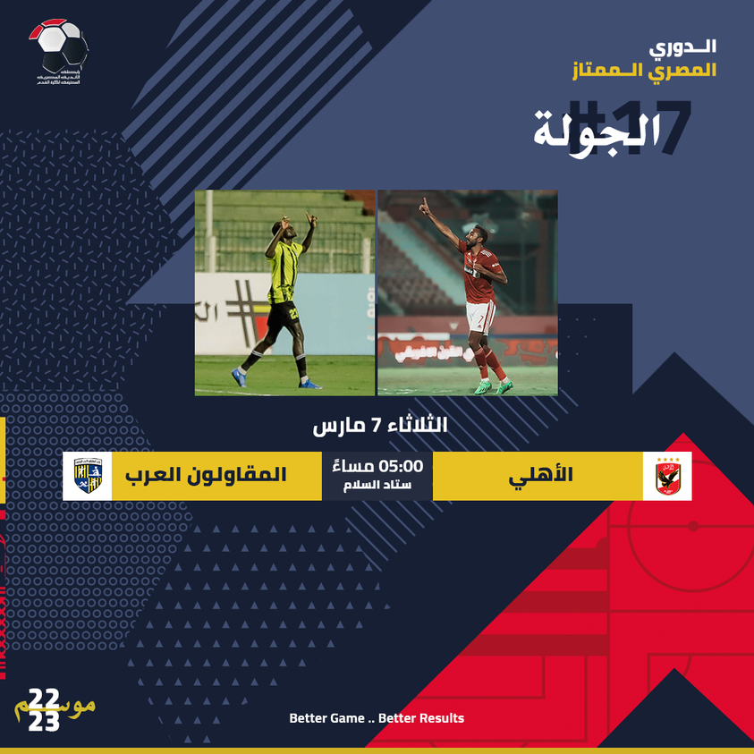 وتقام مباراة الأهلي والمقاولون العرب، مساء الثلاثاء المقبل، على ملعب "الأهلي we السلام"، في إطار الجولة المؤجلة من الأسبوع الـ17 بمسابقة الدوري المصري موسم 2022 - 2023.