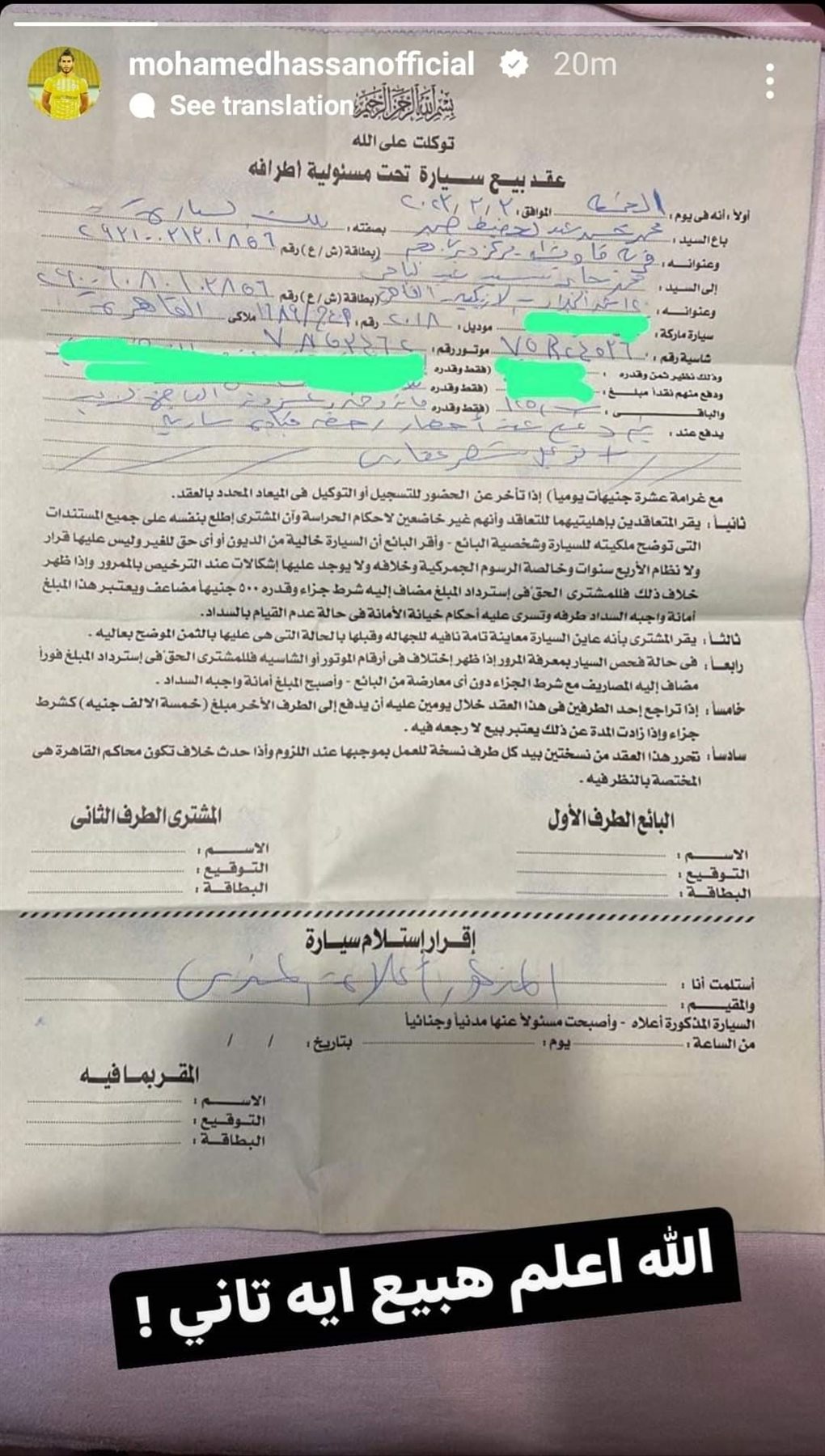 ونشر محمد ستوري عبر صفحته الرسمية على موقع التواصل الاجتماعي إنستجرام صورة من عقد بيع سيارته وكتب: الله أعلم هبيع إيه تاني.
