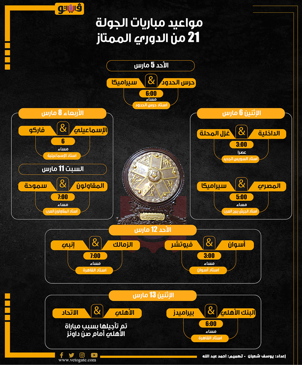 مواعيد مباريات الجولة 21 من الدوري الممتاز (انفوجراف) الأحد 05/مارس/2023 - 01:14 م 3/5/2023 1:14:43 PM مواعيد مباريات الجولة 21 من الدوري الممتاز، فيتو يوسف شعبان شارك طباعة 18 حجم الخط شارك طباعة الدوري المصري الدورى المصرى الممتاز حرس الحدود غزل المحلة الاسماعيلي المقاولون العرب الزمالك الأهلي
