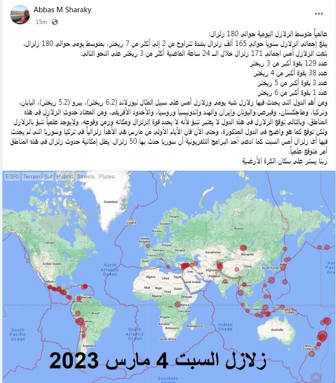 وكتب الدكتور عباس شراقي، عبر صفحته بالفيس بوك، تدوينة كشف فيها خريطة الزلازل فقال: "عالميًا متوسط الزلازل اليومية حوالى 180 زلزال: يبلغ إجمالى الزلازل سنويا حوالى 165 ألف زلزال بشدة تتراوح من 2 إلى أكثر من 7 ريختر، بمتوسط يومى حوالى 180 زلزال".
