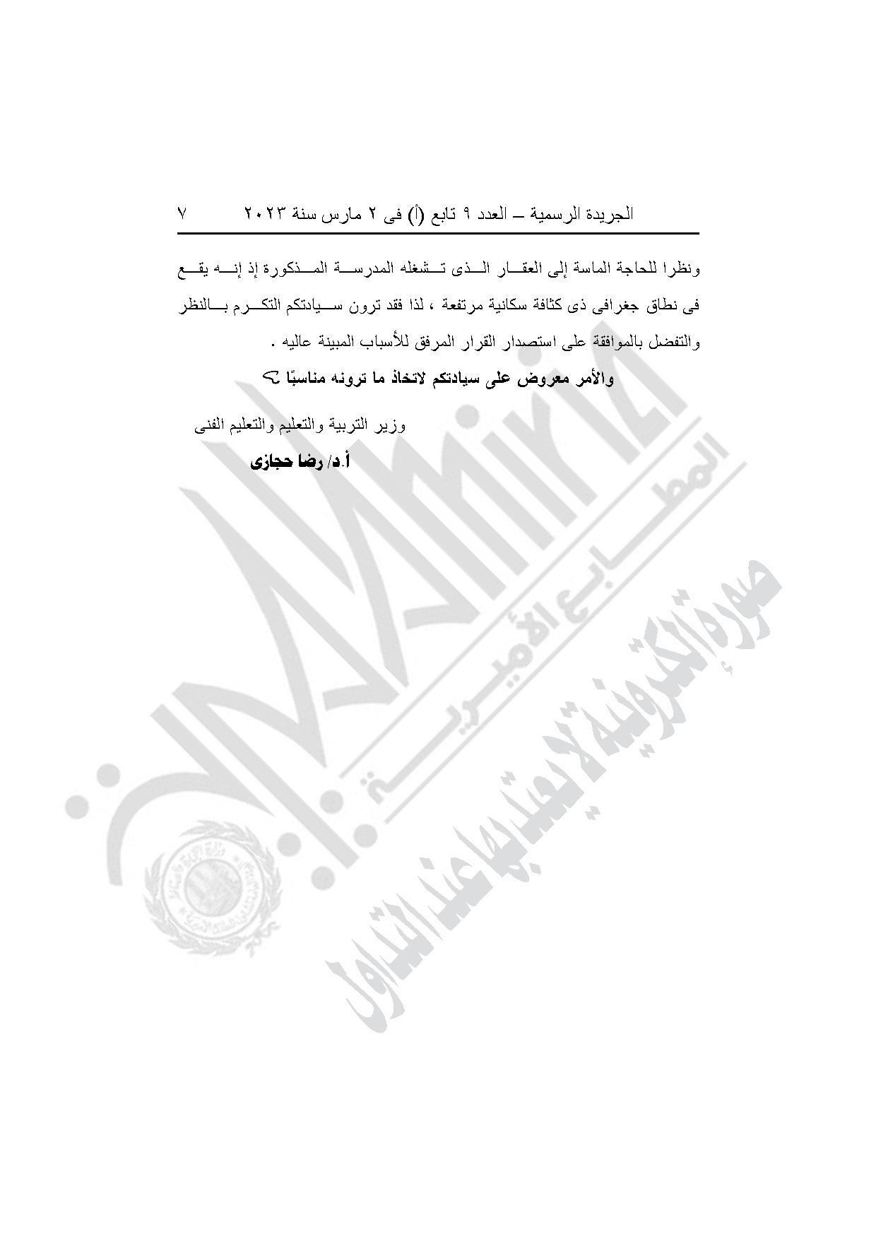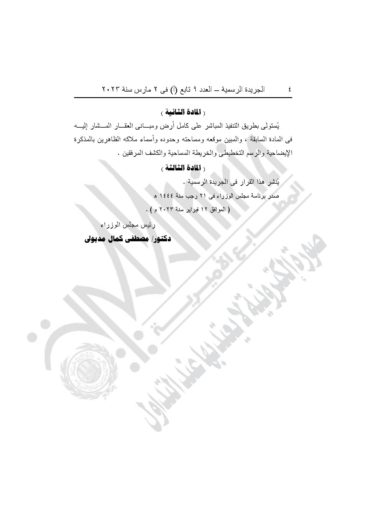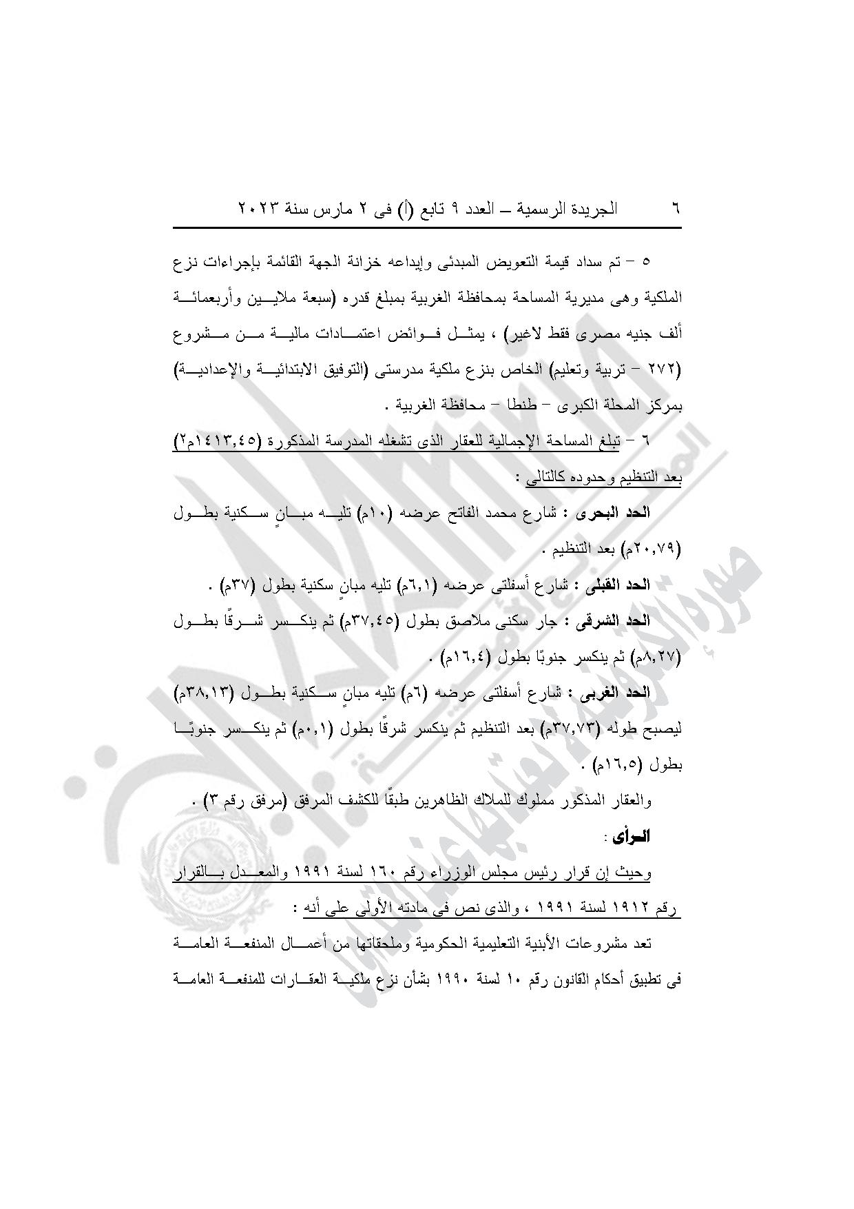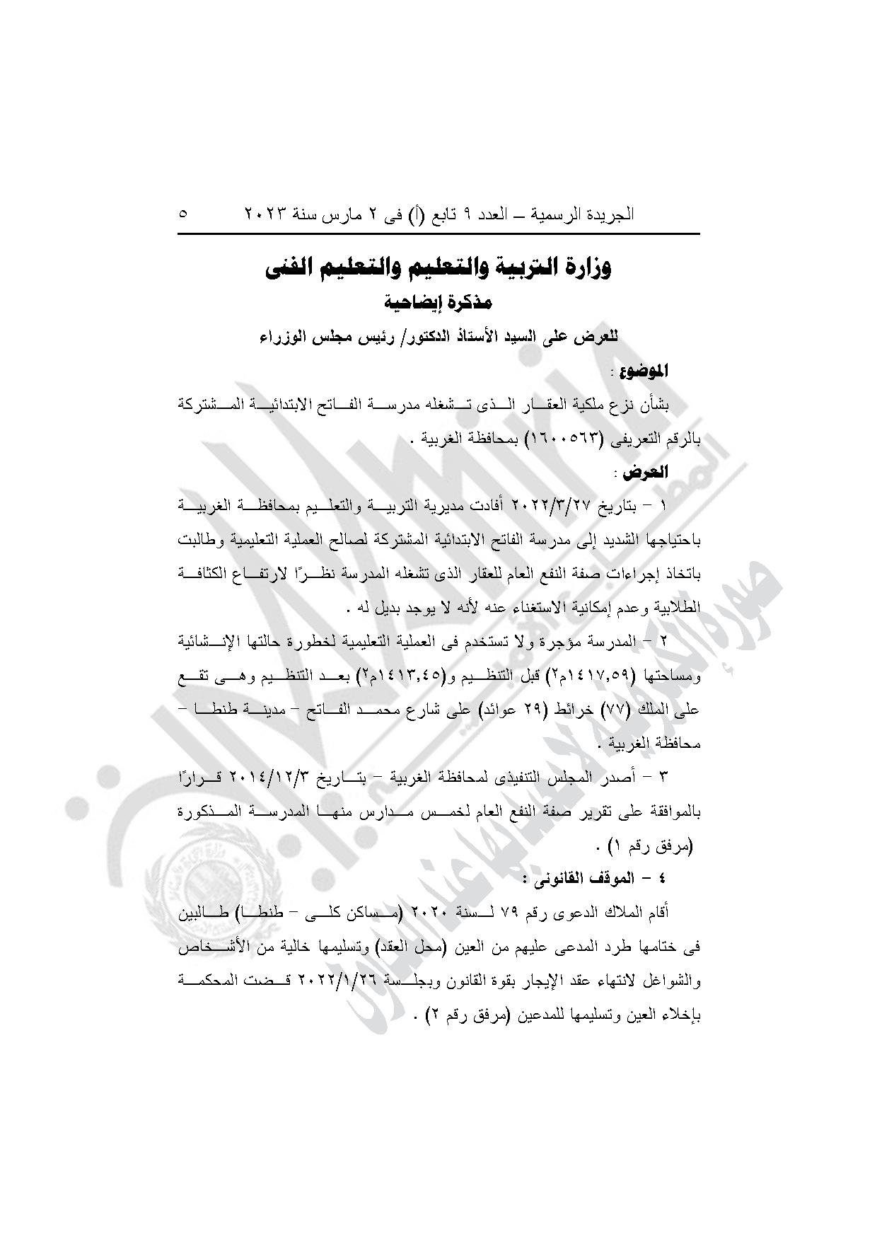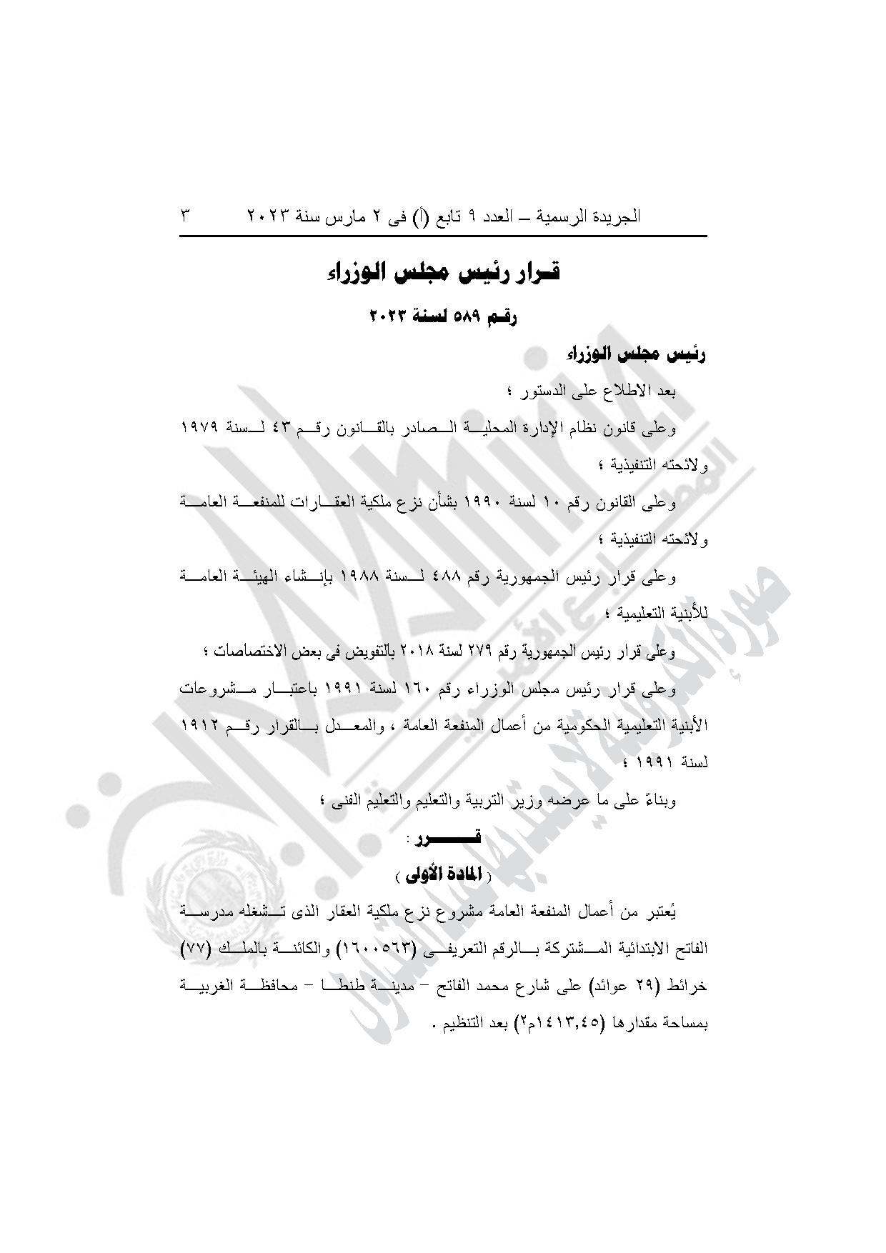 -وفي العدد رقم 9 تابع (أ)، الصادر في 2 مارس 2023، نشرت الجريدة الرسمية قرار رئيس الوزراء رقم 589 لسنة 2023، باعتبار مشروع نزع ملكية العقار الذي تشغله مدرسة الفاتح الابتدائية المشتركة والكائنة بالملك (77) خرائط 29 عوائد، على شارع محمد الفاتح مدينة طنطا محافظة الغربية من أعمال المنفعة العامة.