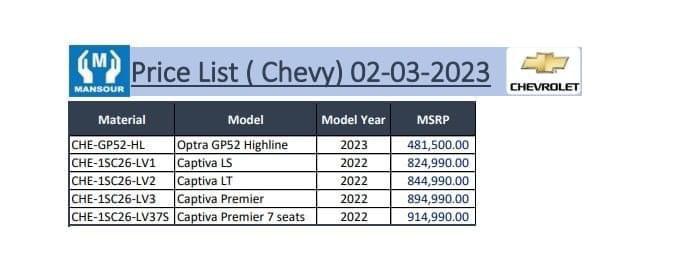 سيارات شيفروليه، استعرض الوكيل المحلي للعلامة التجارية شيفروليه، اسعار السيارات بعد الزيادات الجديدة التي لحقت بالأسعار خلال شهر مارس الجاري