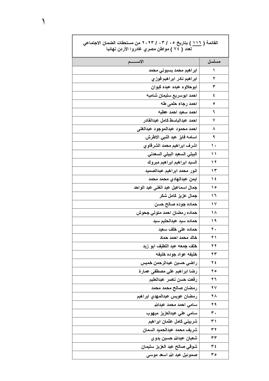 وأضاف الملحق العمالي أنه طبقا لإجراءات المؤسسة العامة للضمان الاجتماعي بالأردن،سيتم استرجاع المبالغ غير المصروفة بعد مرور 50 يوما من تاريخ الإعلان عن تحويل المستحقات، مشيرا إلى أنه يتم بشكل مستمر التنسيق والتجهيز لإرسال باقي الدفعات لمستحقيها تباعا، فور تدقيقها من الجهات المعنية حفاظا على حقوق المواطنين المستحقين لهذه الدفعات، وتضم القائمة الجديدة الأسماء المرفقة.